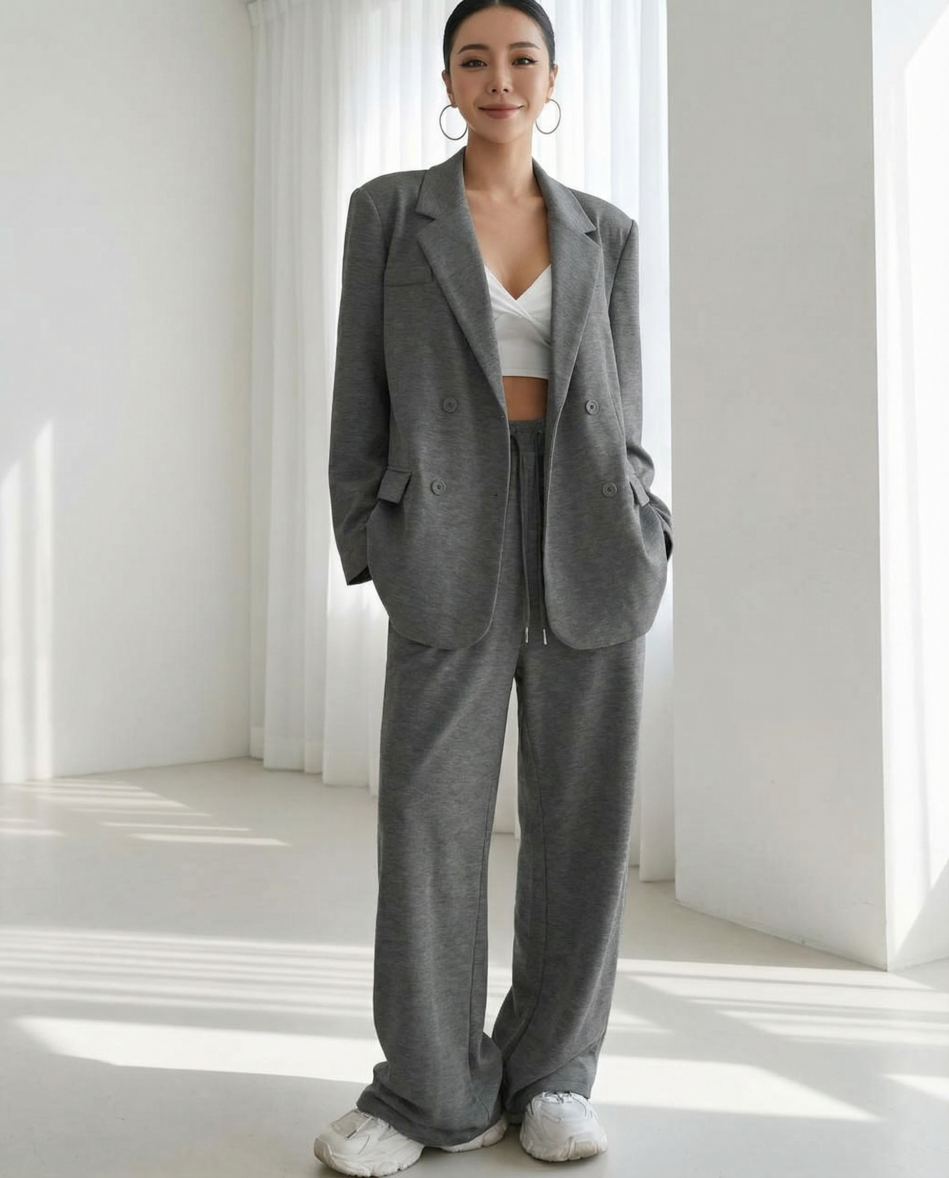 Son blazer structuré apporte une allure chic et affirmée, tandis que le pantalon fluide à taille élastique garantit un confort absolu au quotidien.